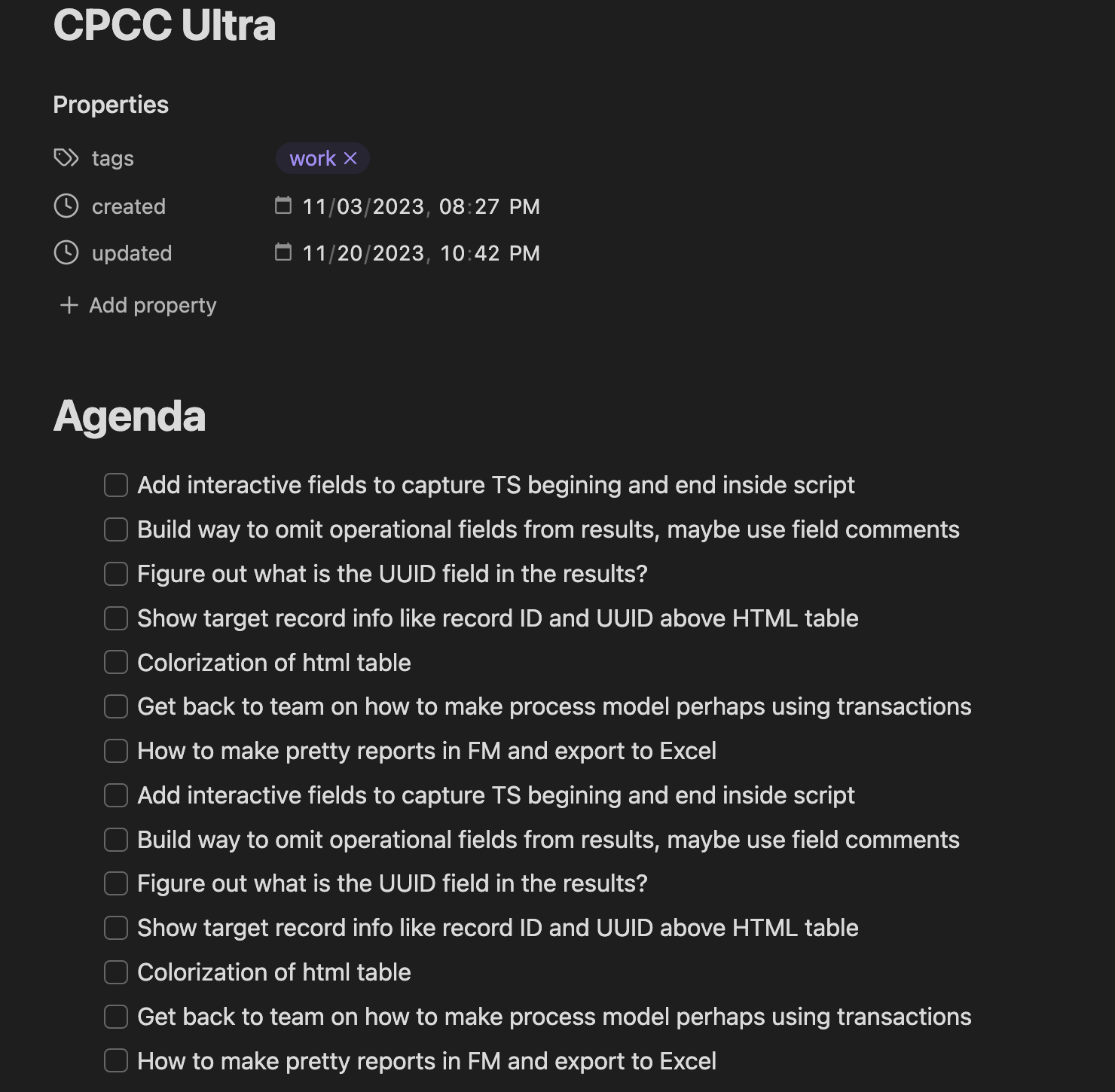 Found an amazing dataview technique from#nicole where you fetch hashtag todo items from anywhere (or potentially a single note) and put them in a note. This works fantastic for putting an agenda at the top of a note. If you filter the to do items to only not-done, you end up with a list that goes away if you finish all items during the meeting. Example image from CPCC Ultra: